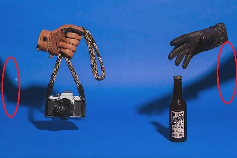 如果没有合适的细线或者懒得做悬吊装置,你也可以戴着手套,抓着物体来拍摄。拍摄流程还是一毛一样的:找背景——打硬光——拿着拍一张——拍空场景——后期。