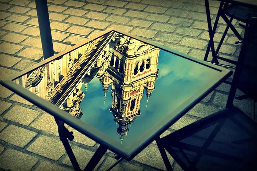 当你使用带边框的反射面(如镜子、光滑桌面、眼镜)或体积很有限的反射面(如小水坑)时,会形成类似框架式构图的效果,让反射倒影部分变得颇为“吸睛”。