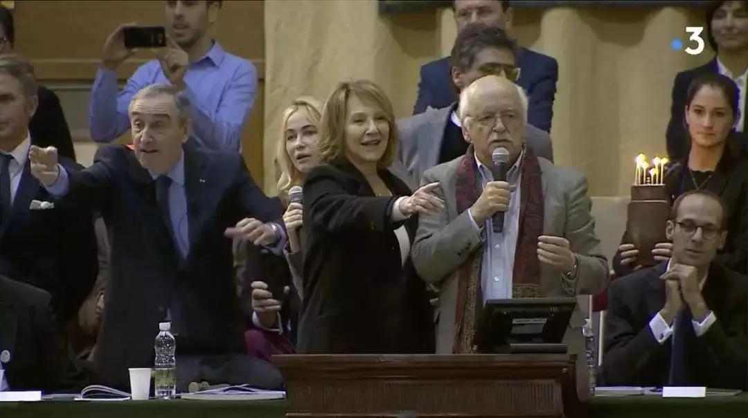 ▲ 2018年总统桶拍卖。拍卖嘉宾:Erik Orsenna(男)和Natalie Baye(女)
