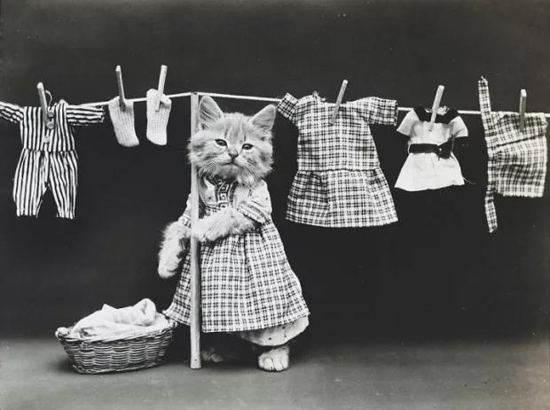 请大家放心,据当时媒体报道,猫咪穿的衣服都是弗里斯母亲缝制的,外表看起来是普通的衣服,内部其实是和背景布相连的小口袋。还有一些小道具可以将猫咪的动作固定。