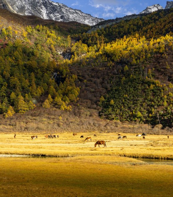 央迈勇雪山是稻城景区中著名的三座神山之一,它的海拔最高,终年积雪不化。草甸尽头一座雪山拔地而起,直刺蓝天。