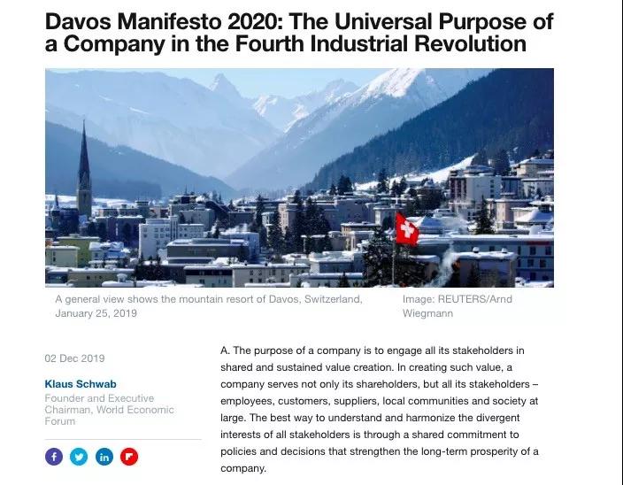 刚刚发布的2020年《达沃斯宣言》写道:企业不仅要为股东,也要为所有利益相关者(员工、客户、供应商、当地社区和整个社会)服务。在细则中,“为客户服务”是第一条,“为股东提供投资回报”则被放在最后一条。
