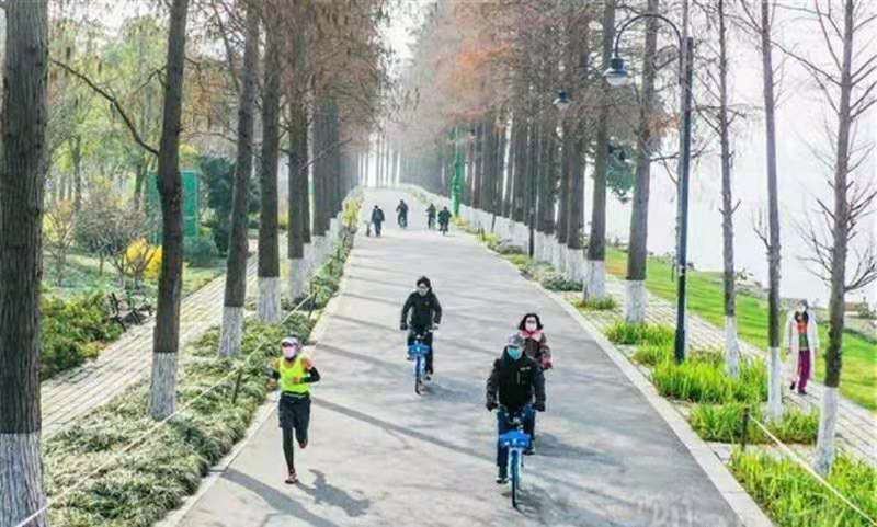 1月28日,大年初四。武汉封闭离汉通道第六天,终于迎了阳光明媚的一天。东湖绿道上戴着口罩骑行的人们。