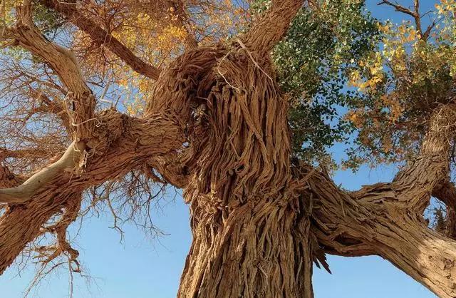 采用仰视角度拍摄树木的枝干,岁月留下的斑驳痕迹在蓝天背景的衬托之下显得特 别突出,画面也因此充满了百折不挠的力量感和张力