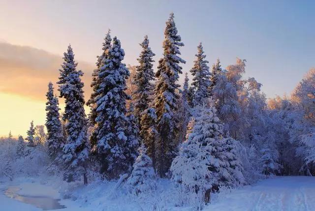树木在大雪之下安静地沉睡着,蓝色的色调使其更 显冰冷与安宁。忽然,一抹霞光闯了进来,画面最 终表现出光影丰富、色调迷人的效果