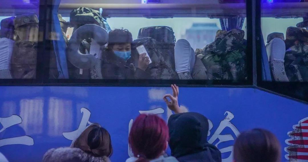 2020年1月27日下午3时许,在哈医大二院,黑龙江省首批援助武汉医疗队的成员们即将出发。车上的医疗队员与家人依依惜别。