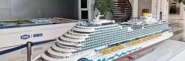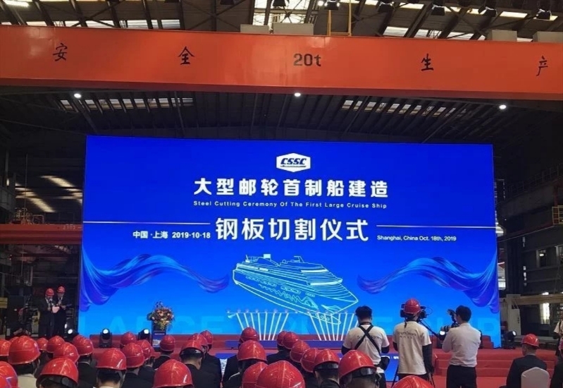 如果说效果图是品牌还没确定的产物,2019年10月18日上午10时40分左右,我国首艘国产大型邮轮在上海正式开工建设,现场的图片依然是这样的: