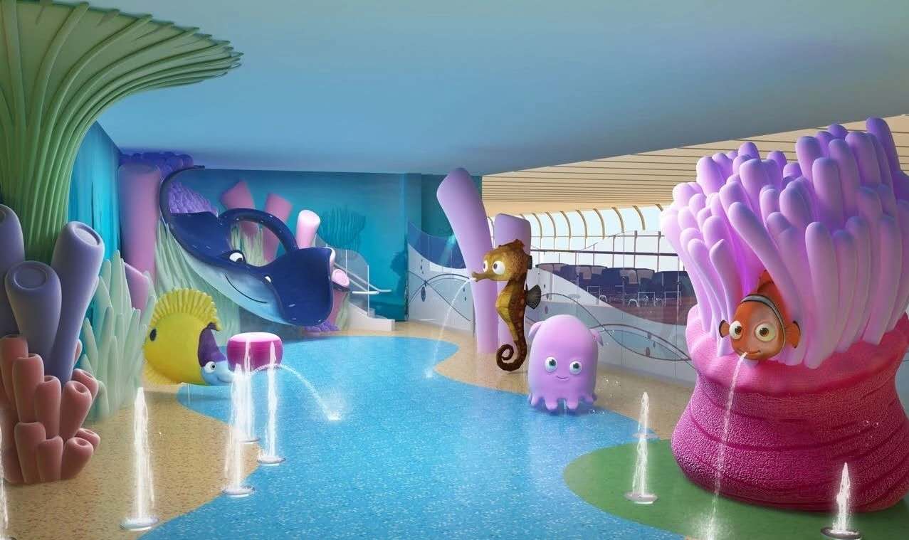 孩子们可以在尼莫(小丑鱼)的珊瑚礁海滩上休息一下,这是由玻璃围墙包围,1500平方英尺,柔软的湿甲板表面区域的完美的海滩,迷你水游戏区,一个有趣的水上乐园,里面有迪斯尼电影《海底总动员》里的水下角色。