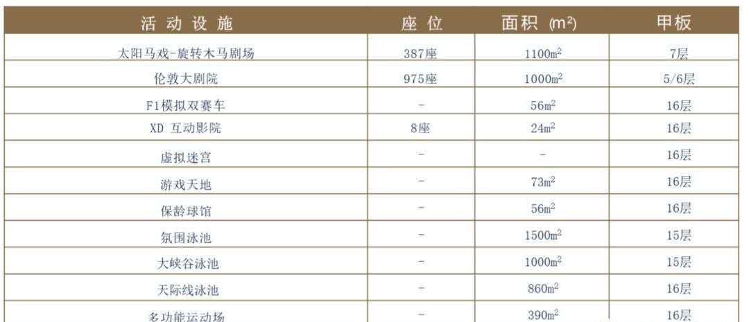 在意大利知名儿童品牌智高(CHICCO)细心安全的设施和目不暇接的可爱玩具中,3 岁以下的宝 宝尽情探索童真的小宇宙;3-11 岁的宝贝能再缤纷的乐高(LEGO)海上乐园中组装自己的海上城堡,12-17 岁的青少年更设有各种球类运动兼容的多功能运动场、82 米喜马拉雅滑水道和 F1 模拟 赛车等,让青春期的小大人在高端安全的空间中自在冒险。