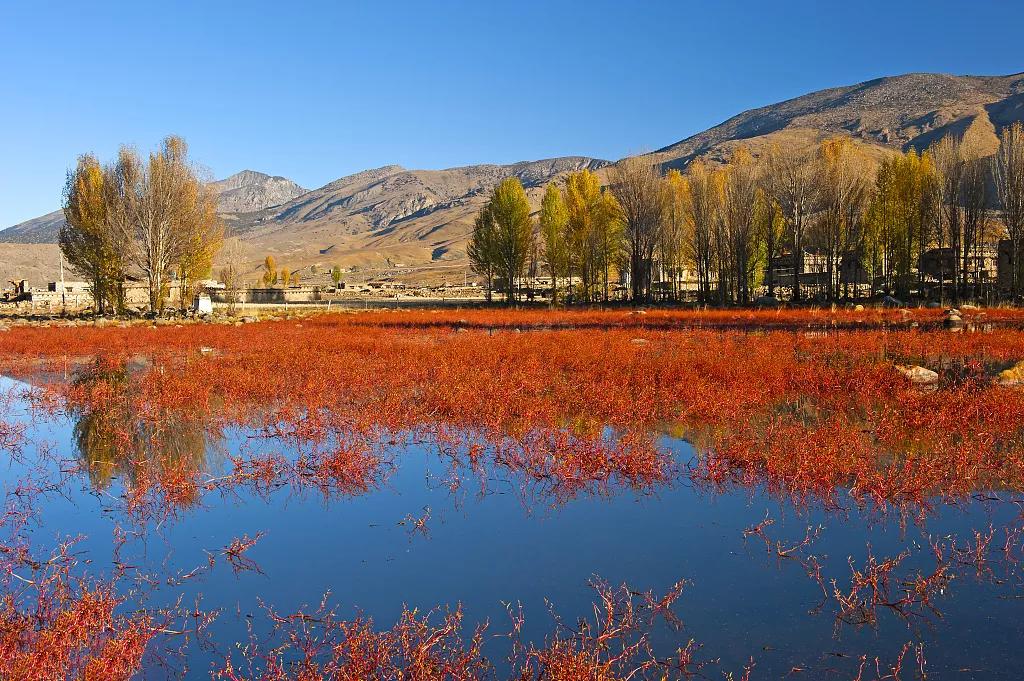 如果刚好遇到红草季,我们将前往【桑堆红草地】,欣赏那一抹浪漫的“高原红”。生长在水中的红草,大都疏密相间,像灌木枝扎根在水池中。这些红草在阳光的照射下,紫里透红,非常吸引眼球。远处山腰斜坡上硕大的藏文六字真言,发散着一种雪域高原的神秘与庄严。