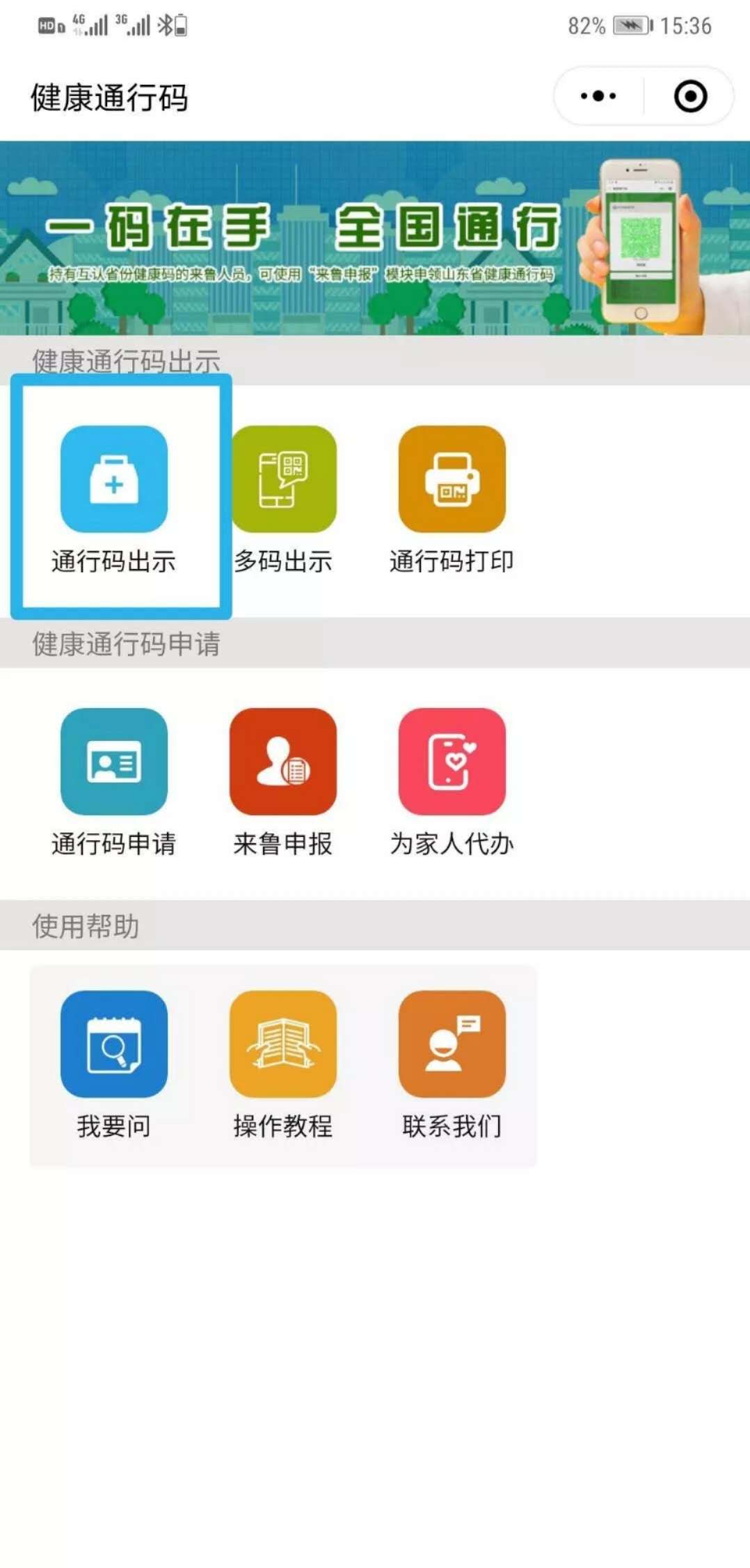 (一)山东省居民可直接点击“健康通行卡”栏目,选中“通行码申请”按照提示,仅需填写姓名、证件类型、证件号码、手机号码、国籍(地区)、居住地址、14 天内接触史7 项基本信息,并做出承诺后,即可领取健康通行码。