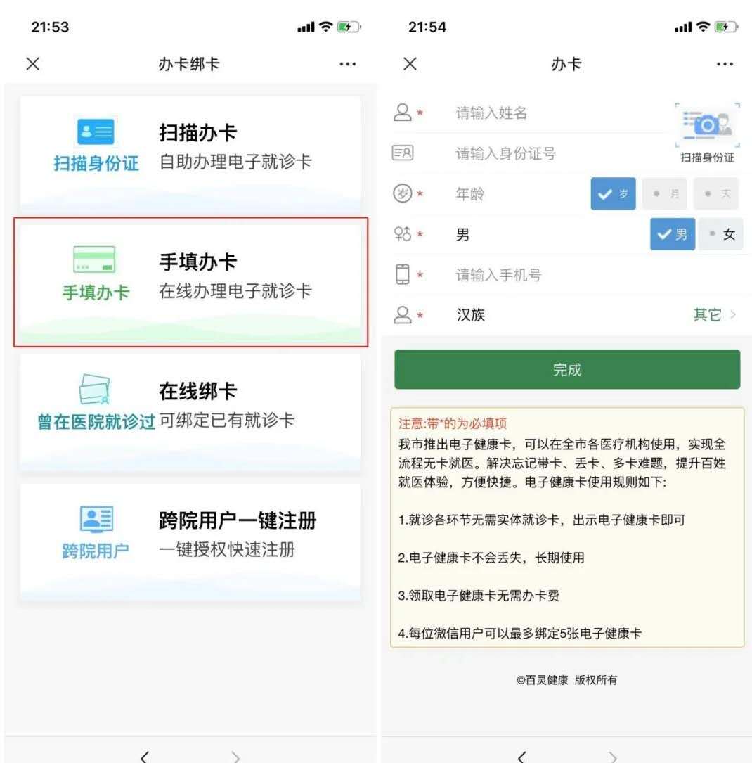 进入“健康聊城”公众号,点击下方“医疗健康”,第一次使用的用户会跳转到办卡绑卡界面,点击“手填办卡”填写信息:
