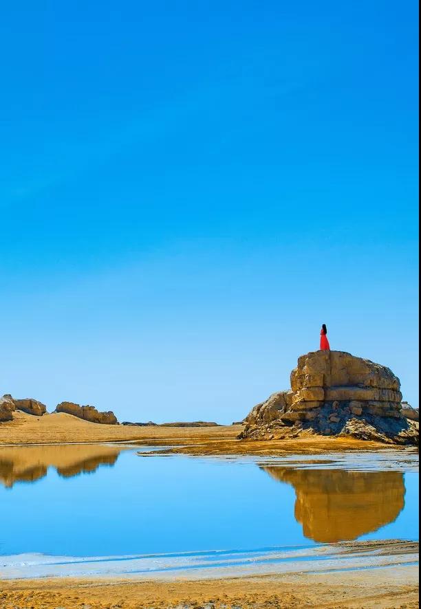 这是世界上唯一一处水上雅丹地貌,因其位置较偏僻,即使是当地人也可能不知怎么过去,所以至今仍是一片未开发的处女地,鲜少有人涉足。这立于汪洋之上的雅丹地貌群经过上千年的风雨残蚀,如同遨游大海显露脊背的群鲸,湖岸边高大的鲸背是天然的观景台,极目远望,西边是高低错落的水上雅丹地貌群,有的如策马扬鞭,有的如奔驰的骆驼,有的像婀娜多姿的女子,魔幻而神秘。以清澈透明的蓝天为幕,参差错落的雅丹地貌与碧波交相辉映,天上鸭鸣雁啼,水中波光粼粼,这一望无际的荒漠中凭空而出了一片”汪洋“,只有亲身看过这一片汪洋上的鬼斧神工之作,才会明白为它为什么会被人称为“魔鬼城”。