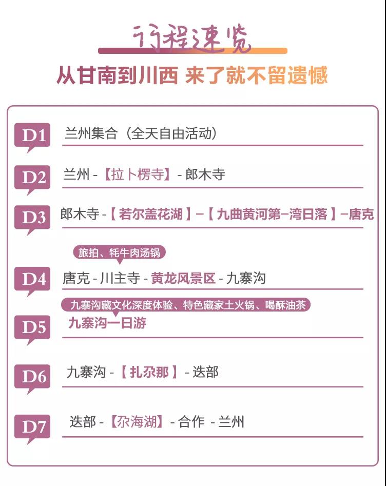 请对应使用我方甘南九寨7日行程,因使用其它行程造成的投诉,责任自负;请仔细阅读以上行程文档,同意并保证遵守我方安排,以免为您带来不必要的麻烦;如产生合同纠纷或人身意外事故,按《中华人民共和国合同法》、《道路交通法》、《保险赔偿条例》裁定;本行程作为旅游合同附页与旅游合同同等法律效力。