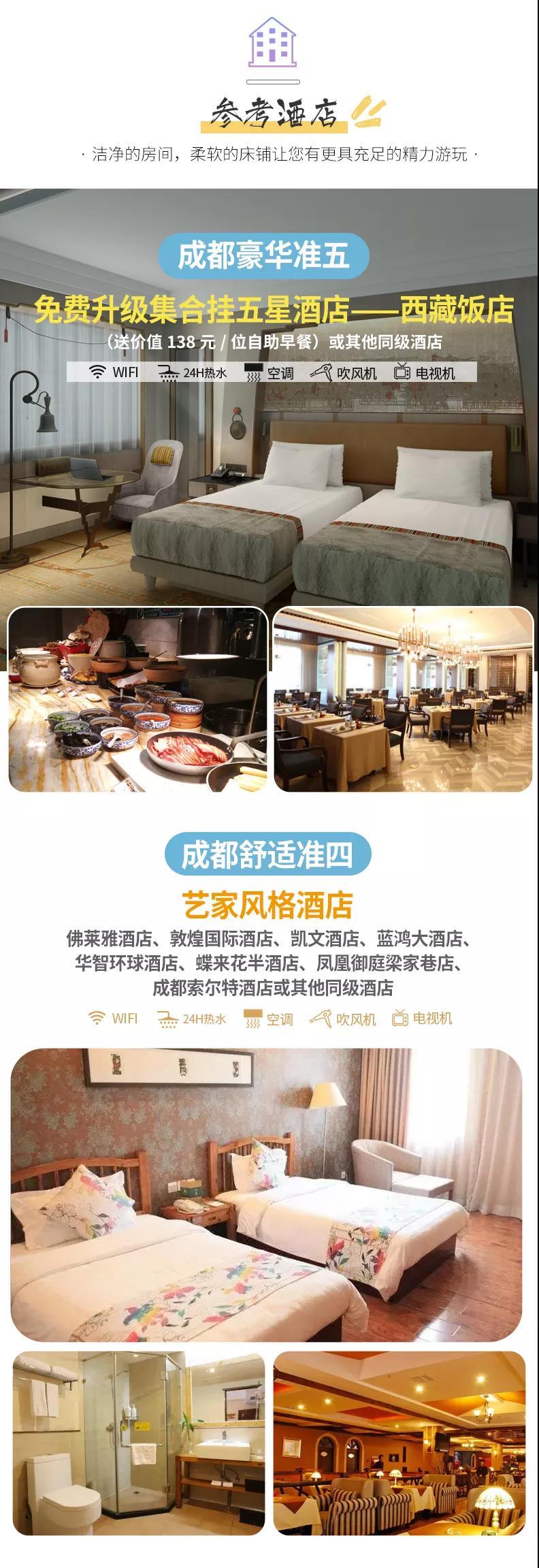 住宿:含4晚住宿;舒适标准全程准四酒店;豪华标准全程准五酒店,免费升级2晚成都挂五星酒店。参考酒店如下: