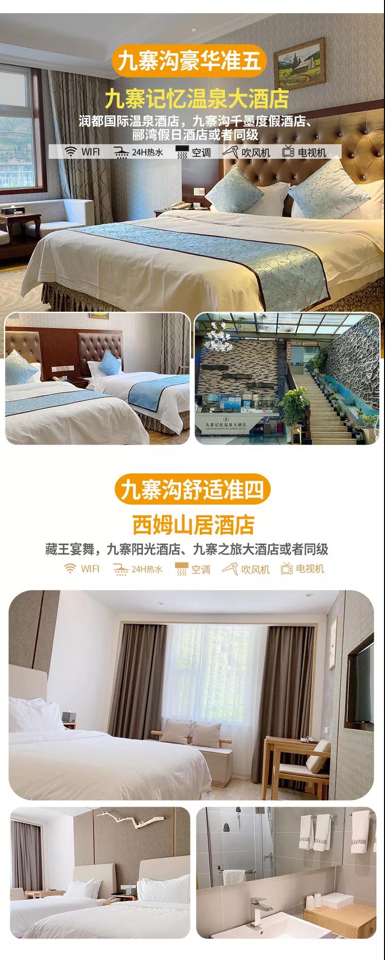 豪华准五:九寨记忆温泉大酒店,润都国际温泉酒店,九寨沟千墨度假酒店、郦湾假日酒店或者同级
