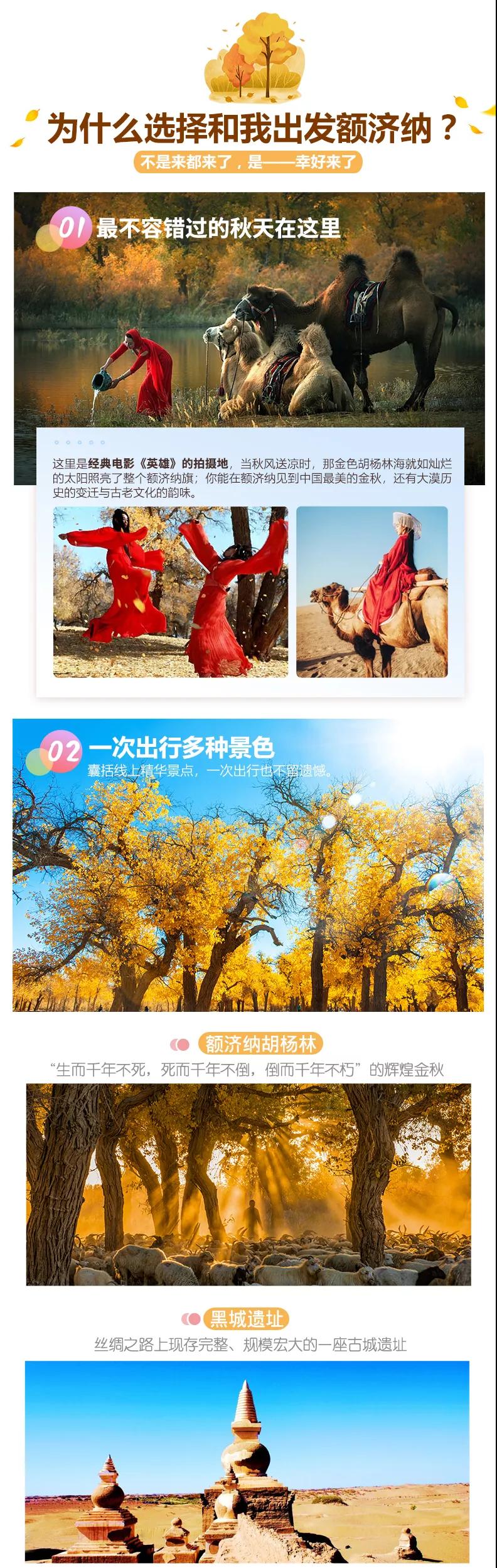 随后我们在【额济纳胡杨林景区】中自行游玩摄影创作,胡杨有“生而一千年不死,死而一千年不倒,倒而一千年不朽”的说法,被世人称为英雄树。千姿百态的胡杨遍布在沙漠中,漫步辉煌的金秋胡杨林,用镜头记录这中国最美的秋景;或者去找寻导游所说的一树三叶的神奇景象——“幼树叶如针似柳眉、壮龄树叶酷似白桦、老年树叶椭圆”,胡杨、蓝天、来自大漠腹地的风声袭来之时,胡杨林便泛起黄澄澄的层层涟漪,显尽大西北秋冬那红盛翠减的独有风情。张艺谋的大片《英雄》中张曼玉与章子怡身着红衣在这漫天的金色胡杨中打斗,踱步在胡杨林,荧屏内的唯美画面一一浮现。