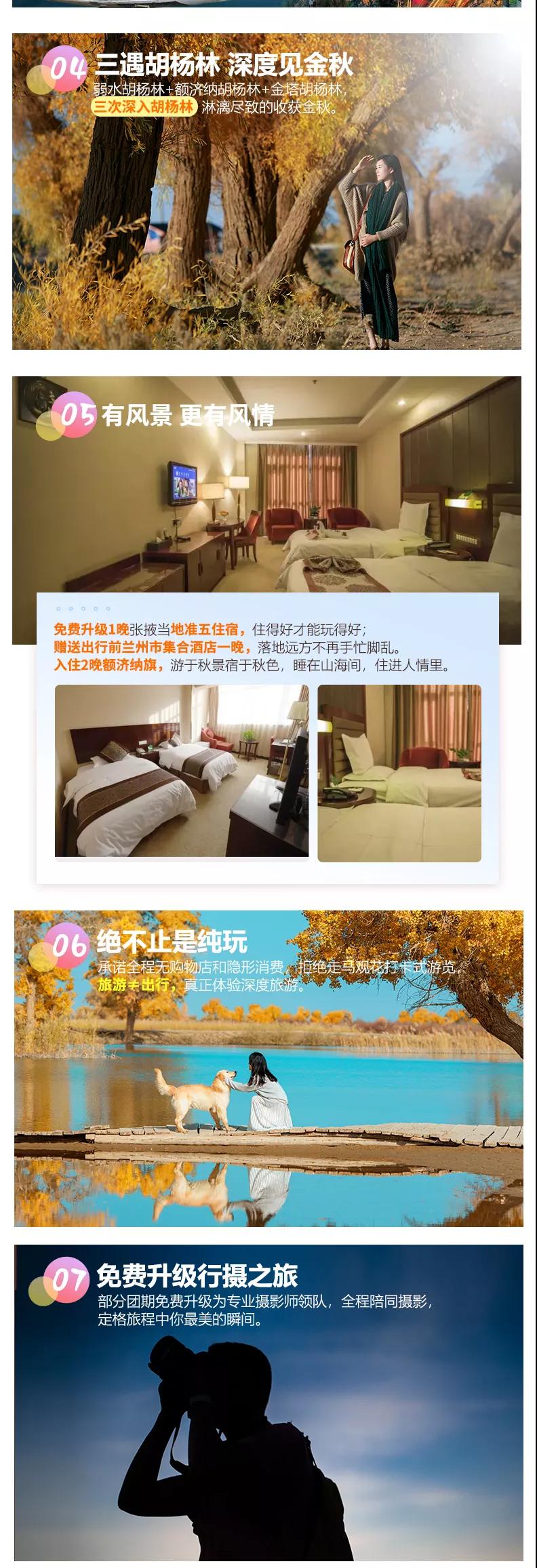 住宿:免费升级1晚张掖当地准五酒店,兰州、嘉峪关入住当地准四酒店,额济纳入住舒适干净双人标间;西北经济条件有限,酒店较南方地区略差,如未达到您的预期,望您谅解。