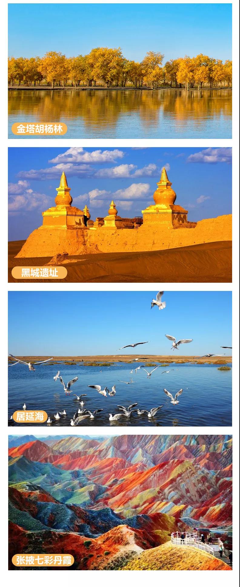 门票:含额济纳胡杨林、黑城-怪树林-弱水胡杨林门票(含景区交通车)、居延海(含景区交通车)、张掖七彩丹霞地貌(含景区交通车)、嘉峪关城楼门票、策克口岸门票。