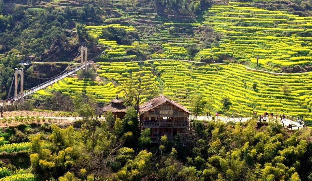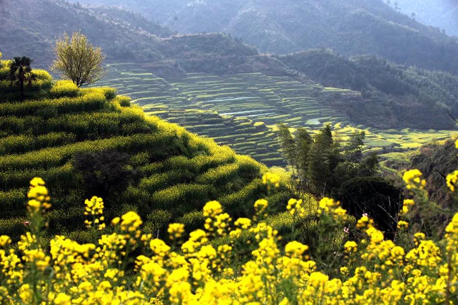 那里漫山遍野的油菜花呈梯田状,从山顶铺散到山谷下。