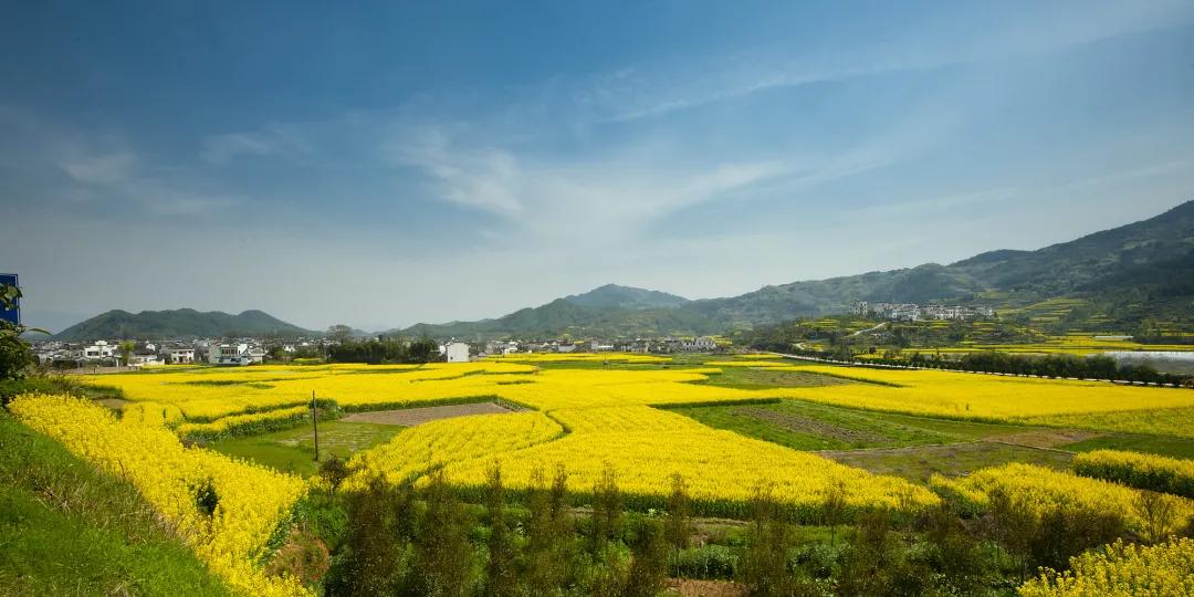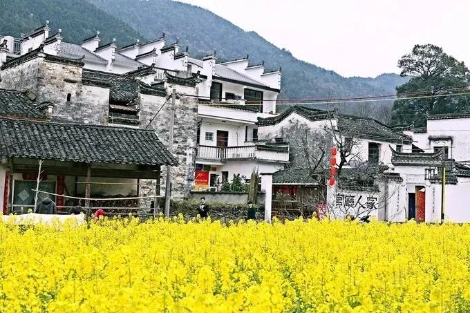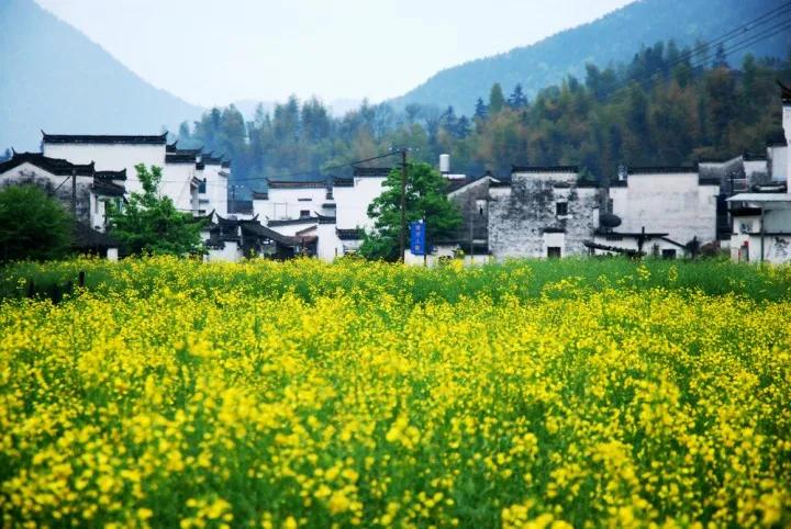 粉墙黛瓦的徽州古民居点缀于广阔的油菜花丛中