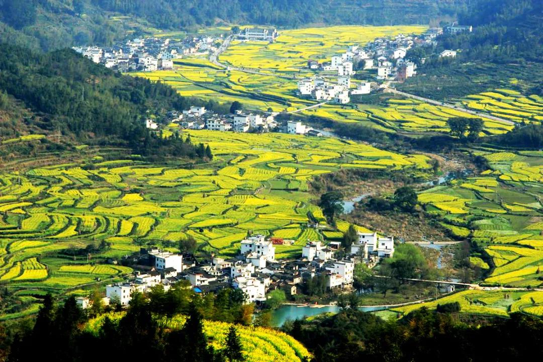 江岭南临晓起,东接溪头,地处婺源县最东北,是婺源最值得去的地方。站在山顶望去,脚下大片的山谷内,油菜花层层叠叠,一望无际,中间围拢着几个小小的村落,黑瓦白墙的徽派民居夹杂在一片金黄之间。