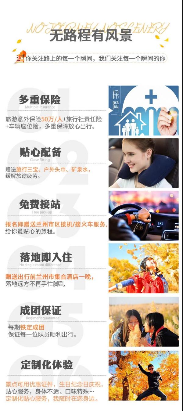 3、赠送:贴心礼包户外百变魔术头巾防晒防沙+旅游三宝缓解乘车疲劳+每人每天一瓶矿泉水;赠送兰州市区接机/接火车服务(23点后由于运管规定不能接机/接站);项目不用不退,望您谅解。