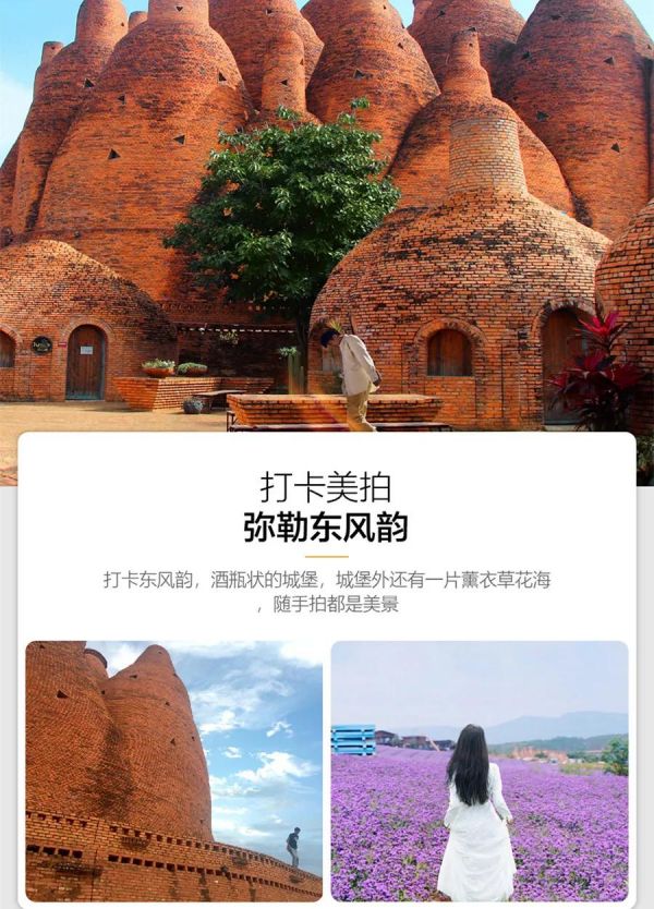 后前往弥勒,游览【东风韵】(含电瓶车),被称为东方波尔多,万亩碧绿的葡萄园,梦幻无际的紫色薰衣草,醉了每一个走进东风韵的人,顺着中国最大的的红砖建筑群万花筒艺术庄园,一路走来,艺术的熏陶和美丽的风景融为一体,让您感受难得的东风韵。游览结束后入住石林温泉酒店,体验温泉给身心的放松。