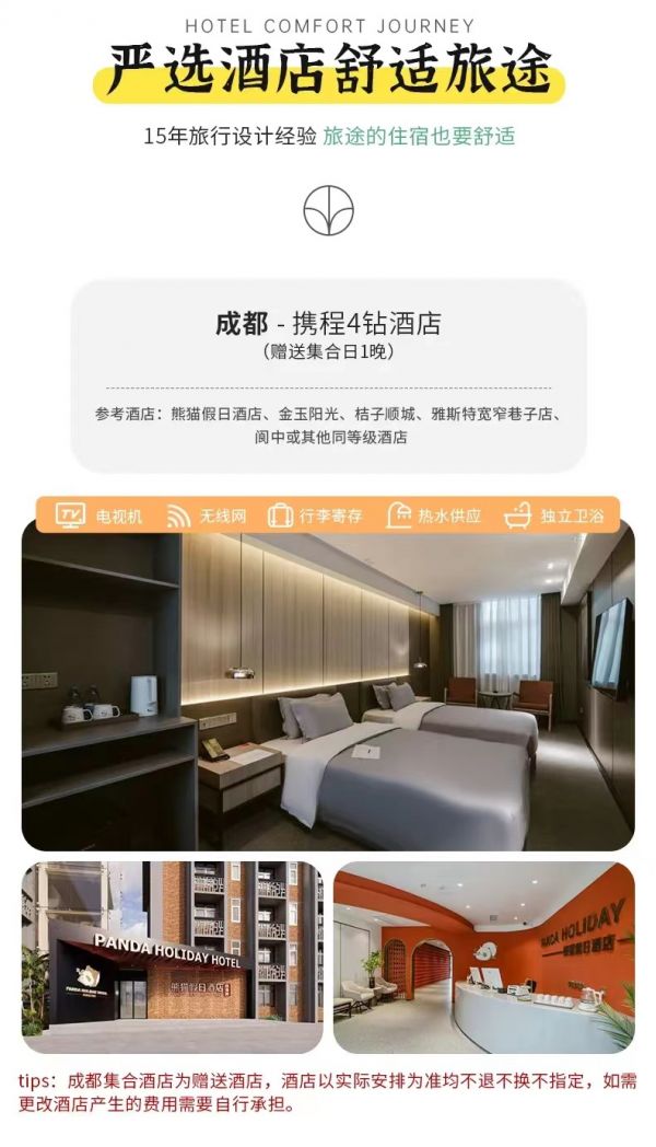 住宿:含全程4晚舒适酒店。(tips:成都集合酒店为赠送酒店,酒店以实际安排为准均不换不退不指定,如要更改酒店产生的费用需要自行承担。)