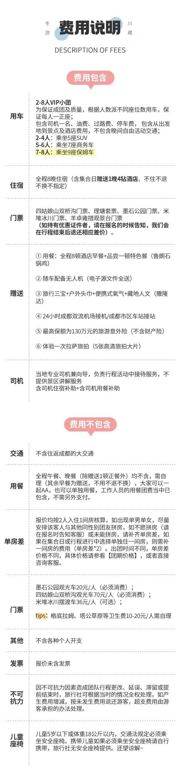 1.冬季11月-次年3月如因鱼子西/格底拉姆封山无法前往,则将鱼子西/格底拉姆景点换为八郎生都。