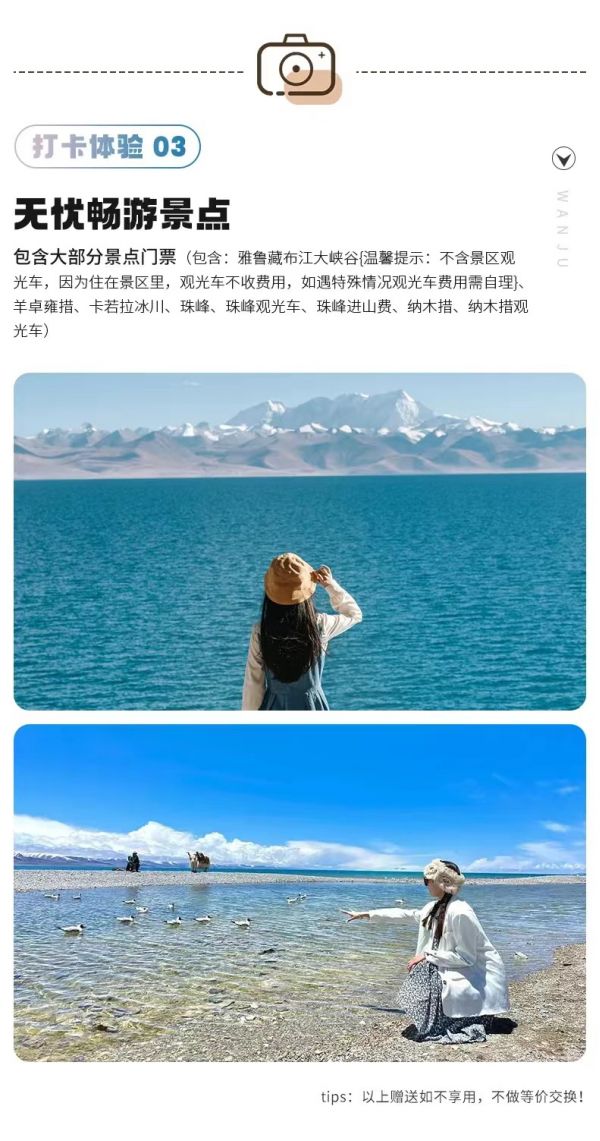 门票:包含雅鲁藏布江大峡谷{温馨提示:不含景区观光车,因为住在景区里,观光车不收费用,如遇特殊情况观光车费用需自理}、羊卓雍措、卡若拉冰川、珠峰大本营门票、珠峰观光车、珠峰进山费、纳木措、纳木措观光车。
