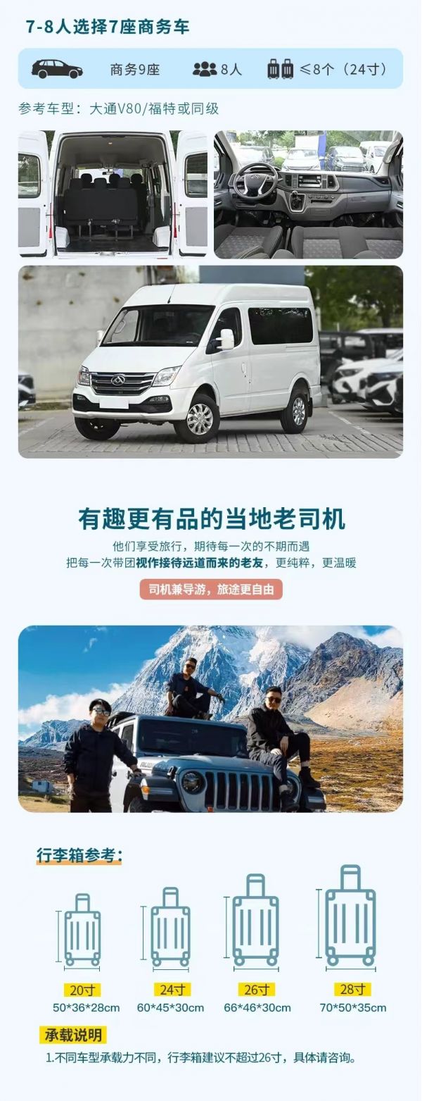 交通:2-8人VIP私享小团,全程舒适商务车出行,车型大小根据实际人数安排,保证一人一正座位,且由驾驶经验丰富的司机为您的出行保驾护航,报价包含车费、油费、停车费、维修费及司机劳务费。住宿:行程所列6晚住宿。我们会提供行程内展示照片的酒店或其他条件相似酒店,但因沿途条件有限,如酒店设施达不到您的期望,请您谅解。