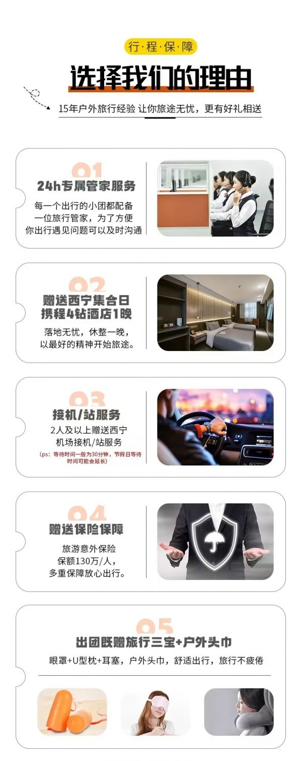 接机/站服务:本次活动提供西宁市内24小时接机/接站服务,工作人员会在您出发日期前一天21:30之前向您推送消息并与您联系,如果超过时间没有接到任何通知,请及时与报名处联系。(接站等待时间一般为15-20分钟,最长不超30分钟,节假日拼单人数较多情况下客人等待时间可能会延长)。