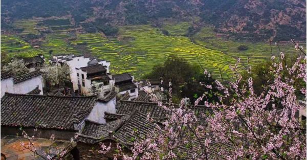 金黄色的花儿从层层梯田沿着山谷流成了海洋。粉墙黛瓦的村落里桃花红、梨花白,还有那满山的树木和曲折幽静的小路。