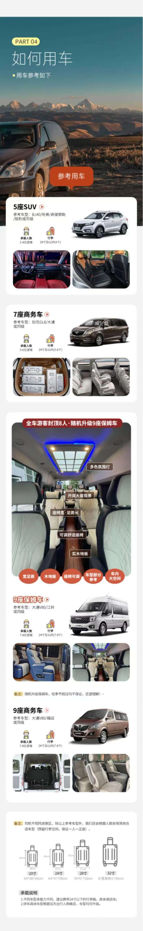7-8位游客:随机升级乘坐9座保姆车(节假日不能保证团团升级)或9座商务车