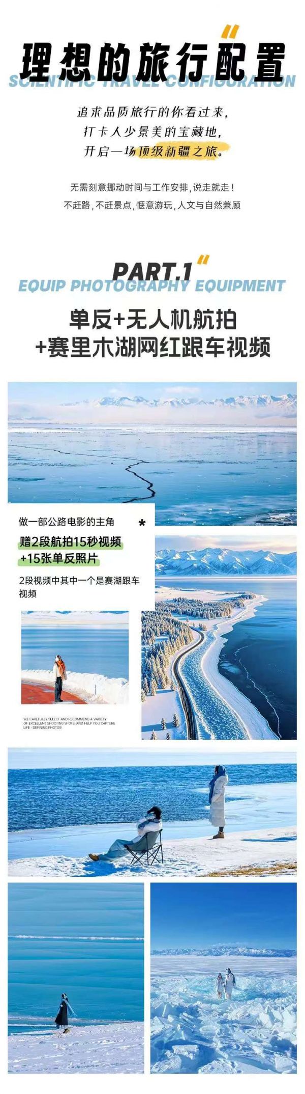 赠送无人机2段15秒视频(含赛里木湖跟车视频),(赠送项目不去不退,仅限天气情况良好安排;如遇师傅没有拍摄2段15秒视频,退50元/人);