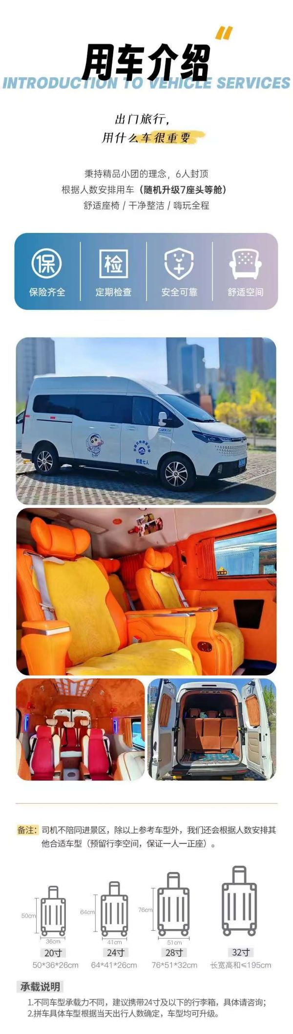 备注:车型承载力有限,携带行李为24寸或以下行李箱。