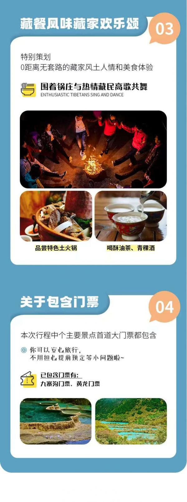 不含景区配套设施及小交通不含九寨沟观光车90元/人(必须消费);不含黄龙上行索道80元/人,下行索道40元/人;黄龙定位讲解器30元/人;黄龙电瓶车20元/人(自愿乘坐,每天5000张票,旺季请提前预定)如需乘坐,请在报名时第一时间在公众号或者携程购买;景区保险:九寨沟景区保险10元/人自理;黄龙景区保险10元/人自理;