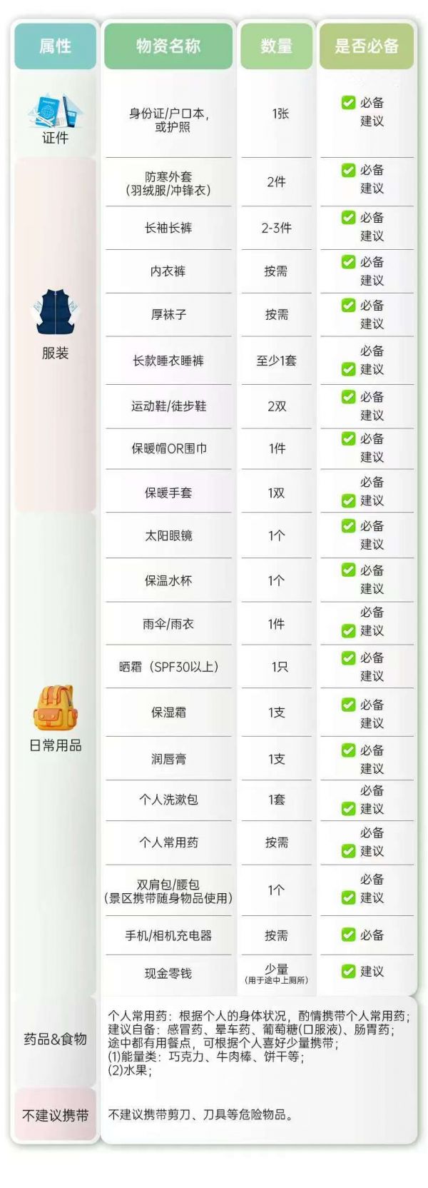 新疆气候多变,昼夜温差大,紫外线强,请大家务必注意防寒与防晒,春夏季节出行,参考以下物品准备行李: