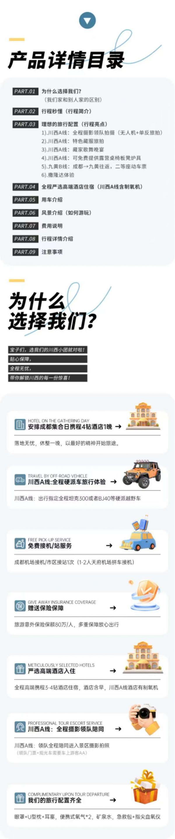 备注:以上项目仅限报名川西A线游客享有,报名九黄B线路游客不享受以上项目(川西A/B线包含如下:)包含成都机场接机/市区接站1次(1-2人天府机场拼车接机);包含80万旅游意外险。