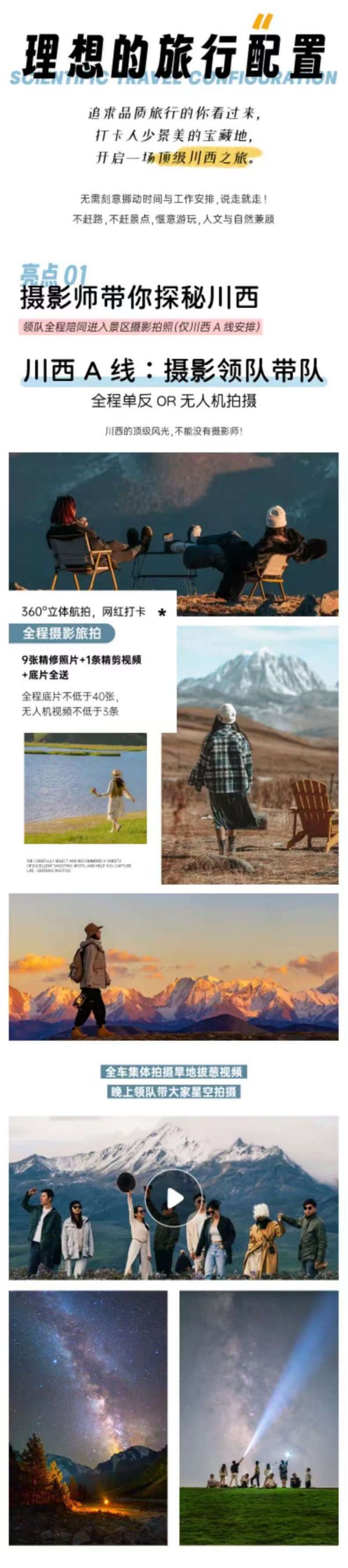 川西A线:随车配备单反和无人机(行程随车配备索尼/富士/佳能/尼康单反(均配置长焦镜头)和大疆御系无人机)。