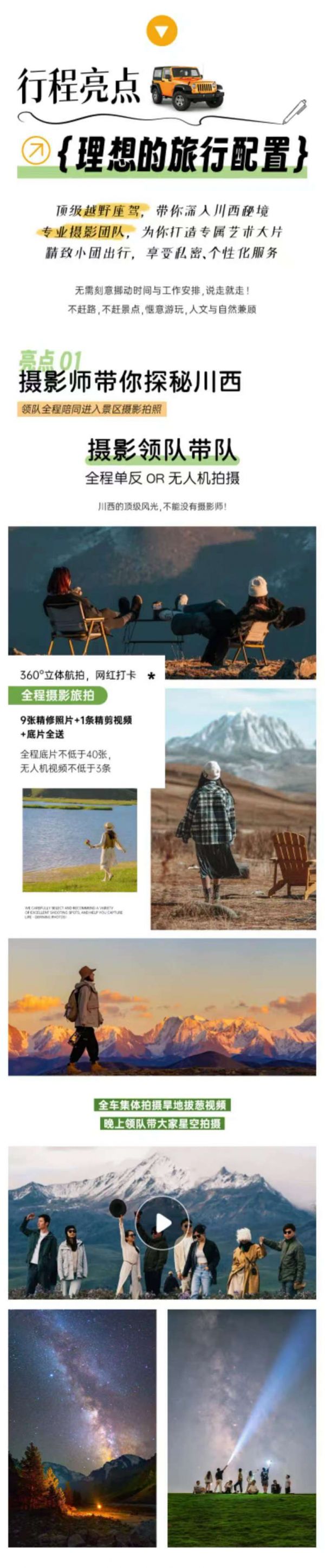 无人机+单反旅拍(底片全送+9张精修照片+1条精剪视频),底片全程不低于40张,无人机视频不低于3条(全车人拍摄旱地拔葱视频,晚上领队带大家星空拍摄);