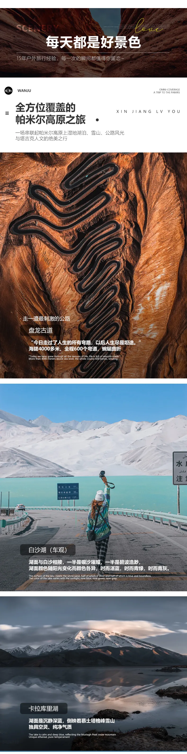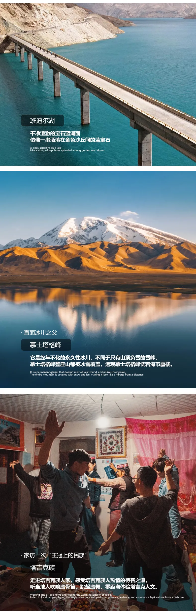 告别“东方摩洛哥”—喀什,我们将开启一段帕米尔高原之旅。沿314国道一路畅游帕米尔高原风光,首先惊艳我们的是背靠白色沙丘和雪山的【白沙湖】,在阳光的变化下,湖水时而呈湛蓝色,时而呈绿色。更令人惊叹的是,蓝色的湖面与白沙相接,一半蓝一半白,而白沙背后还有雪山。在雪山和白沙的映衬之下,白沙湖水更显澄澈。在这里能get湖泊、白沙、雪山同框的画面。分享一个冷知识:白沙湖又名流沙河,就是西游记里唐僧收服沙和尚的地方。我们还能途观慕士塔格峰,山顶常年皑皑白雪,犹如满头白发,十余条冰川镶嵌在峰体下的峡谷中,如胸前飘动的银须,故有“冰山之父”的美称。随后我们将遇见【卡拉库里湖】,这里能看到雪山倒映在湖面的风景,拍出来的照片特别的给人纯净的感觉。
