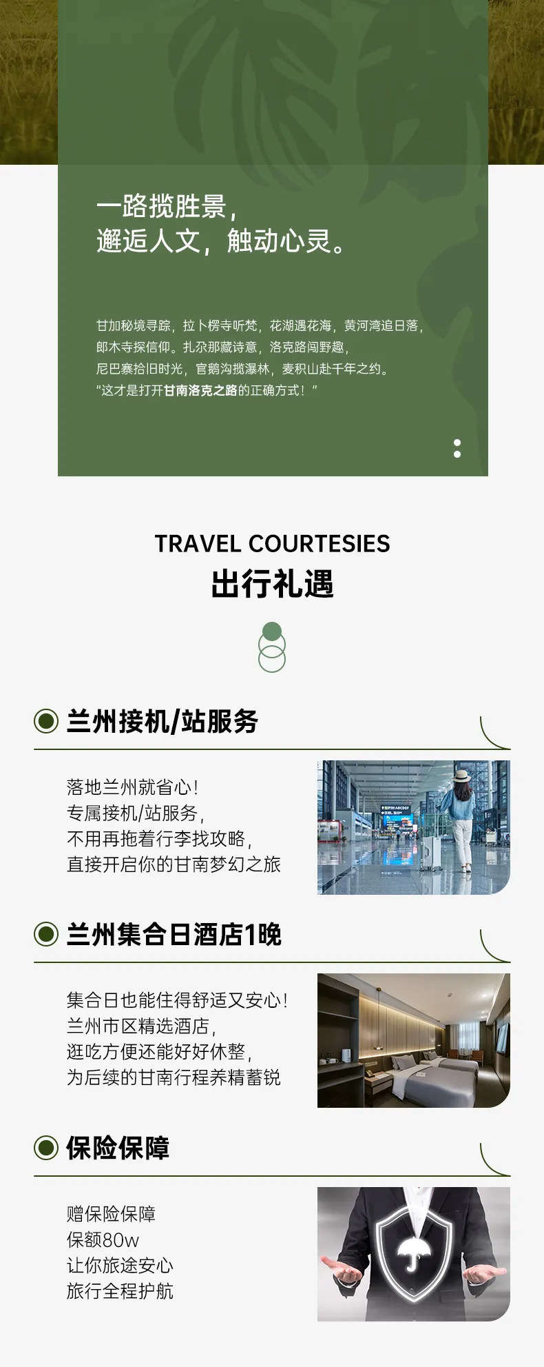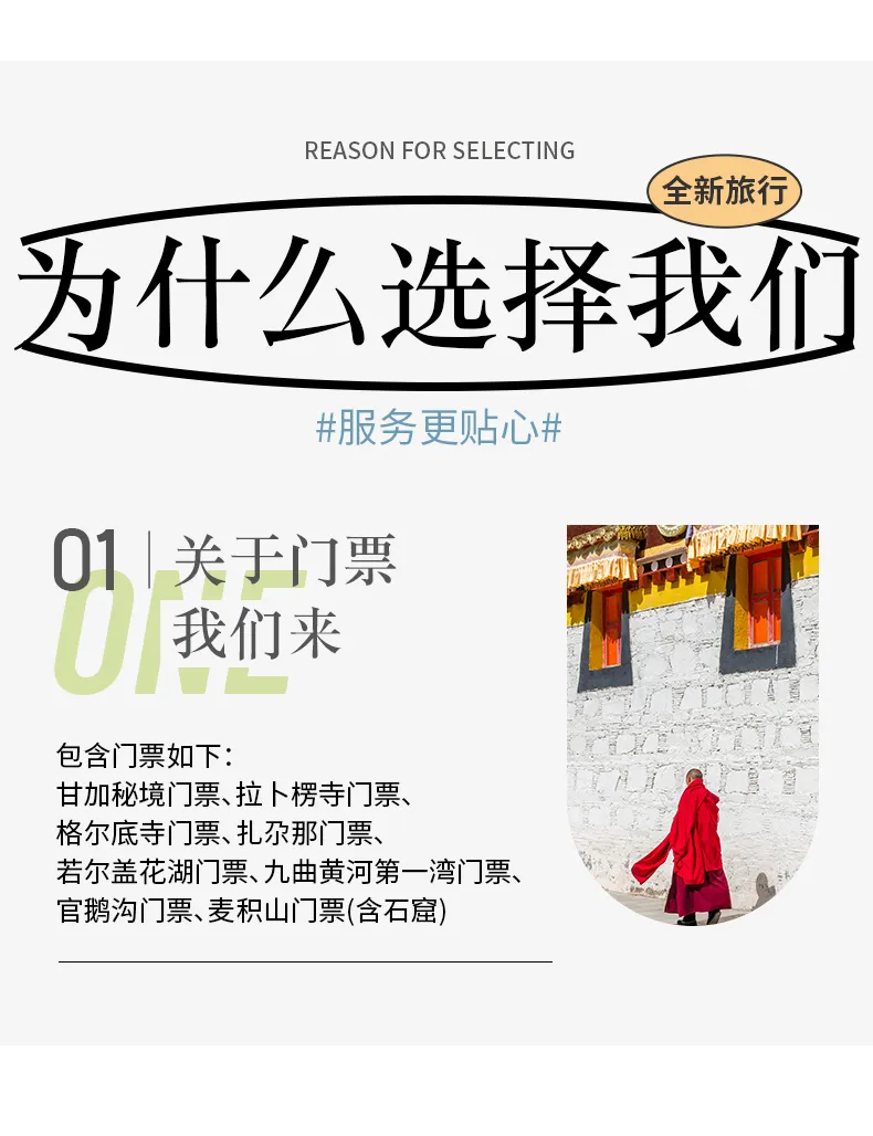 包含甘加秘境门票、拉卜楞寺门票、格尔底寺门票、扎尕那门票、若尔盖花湖门票、九曲黄河第一湾门票、官鹅沟门票、麦积山门票(含石窟)