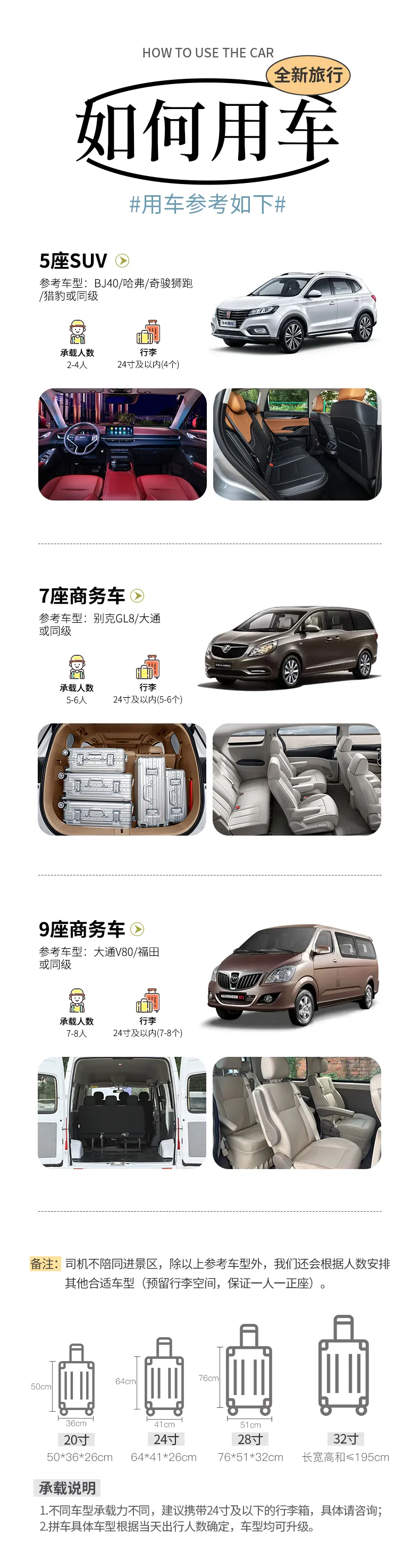 备注:车型承载力有限,携带行李为24寸或以下行李箱。