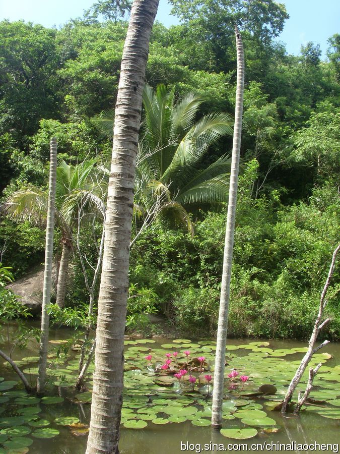 葱翠的热带树木栽种在各处,高高的直插云霄。水中荷叶漂浮,荷花朵朵,好美的一幅水彩画啊!