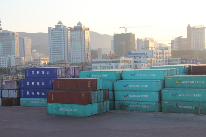 每一批货物都有着胶东海运的标志,而他们排放的整齐性就说明了码头工人的工作的责任性,这些整齐而又有些小规模的货物,就说明了威海码头的运输的庞大性。