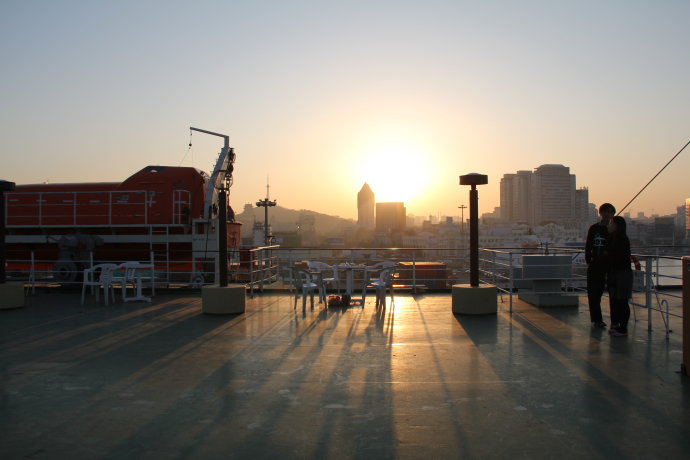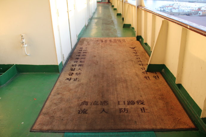 看,这艘船的甲板上,既有提醒游客的热心性。还为甲板上增添了一道亮丽的风景线,而翻译成的韩文,就足以说明了威海码头的国际性。