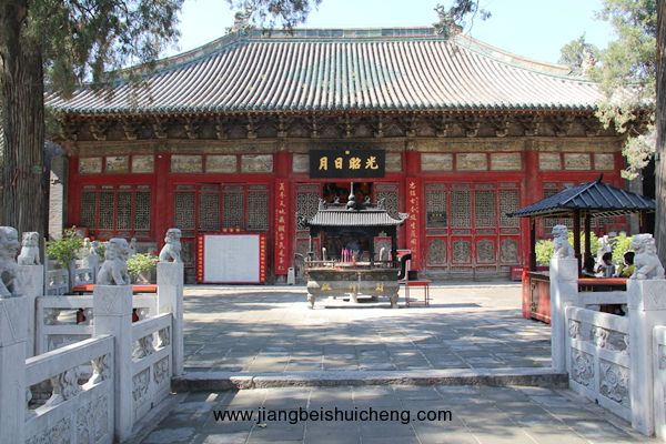 仰面观之,有一块大匾高高悬在大门上,上书“声灵于铄”四个大字,寓意关公美好的声名象美好的音乐一样传扬四方。这块匾是清乾隆十五年乾隆帝所题,同时两侧并题有联曰:“翊汉表神功龙门并峻,扶纲伸浩气伊水同流。”由此可以看出,不仅百姓敬仰关公,古代帝王对关公也同样尊崇。