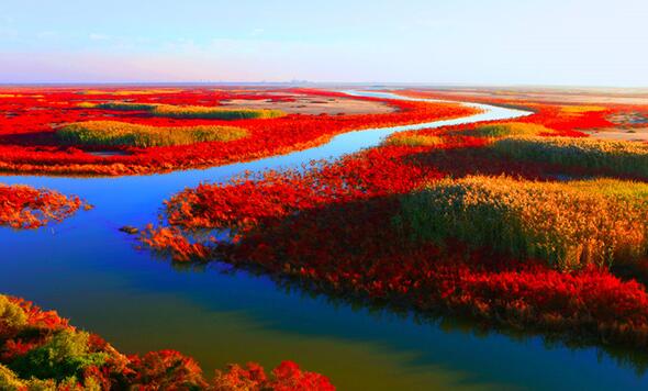 游览后午餐,乘车前往我国北方最大的滨海湿地城市—盘锦市,抵达盘锦后前往游览【盘锦红海滩廊道】(游览约3小时),红海滩地处辽河三角洲湿地,位于盘锦市西南海滨,是由大片红色的碱蓬草形成的著名湿地,红海滩国家风景廊道是红海滩面积最大的景区,在这里你可以漫步于木栈道、看红如炽焰的碱蓬草在海岸线上无限延伸,而红海滩远处的油井在夕阳下更是一副迷人的画卷,秋天来此还能看到金黄色的稻田与红海滩相呼应,以及成群的候鸟展翅于滩涂的深处,游览后晚餐,晚餐品尝盘锦稻香河蟹宴,晚餐后入住酒店休息。